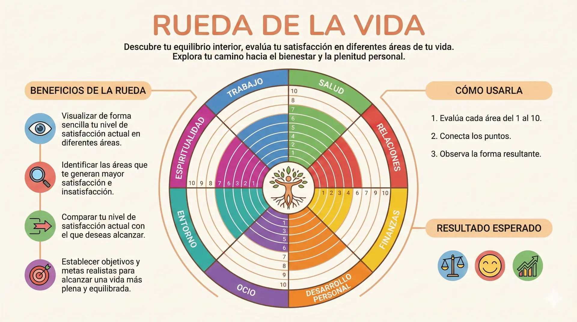 Descubre tu equilibrio interior, evalúa tu satisfacción en diferentes áreas de tu vida. Explora tu camino hacia el bienestar y la plenitud personal. Esta herramienta te permite: